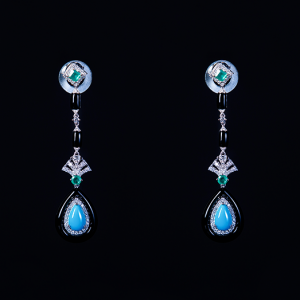 BRINCO EM OURO BRANCO 18K COM TURQUESA, ONIX , DIAMANTES E ESMERALDAS